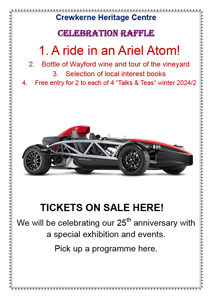 As part of its 25th anniversary events, the museum has organise a celebration raffle for a ride in the Crewkerne manufactured Ariel Atom car. Tickets cost £2 are on sale in the museum. Three other prizes are also available to be won.